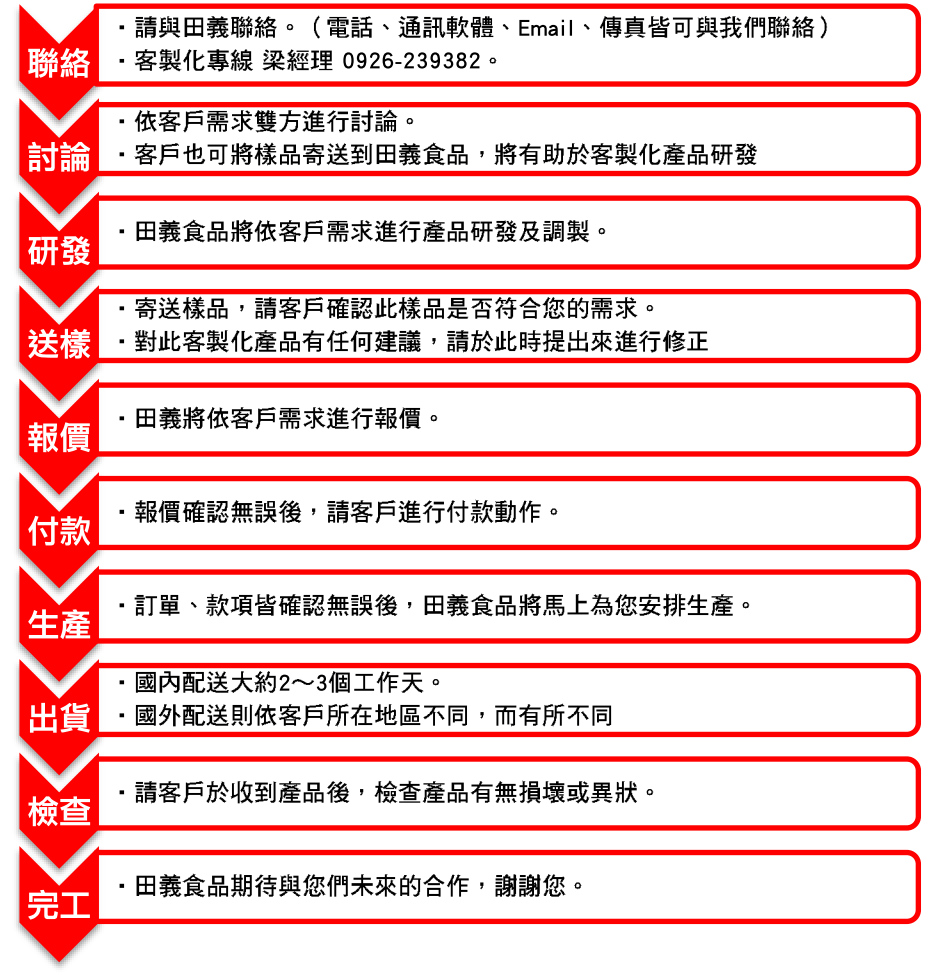 1. 若您第一次訂購田義食品的產品,建議您先訂購少量測試,若合適並達到您的需求,之後再訂購多量