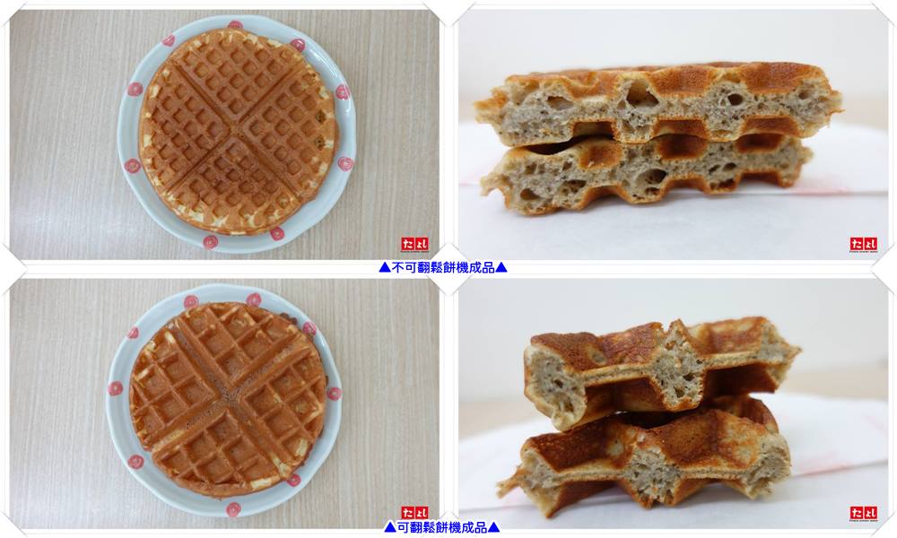 (可翻機台)將已打好的麵糊直接放入烤盤中(建議麵糊量為6-7分滿),烤焙溫度170~175˚C,等候15-20秒後上蓋翻轉,烘烤時間烤4分鐘