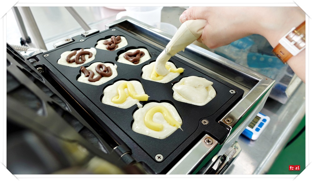 步驟三:先將1/3麵糊擠入烤盤中,再將內餡擠入麵糊中間(依個人喜好加入不同餡料)。