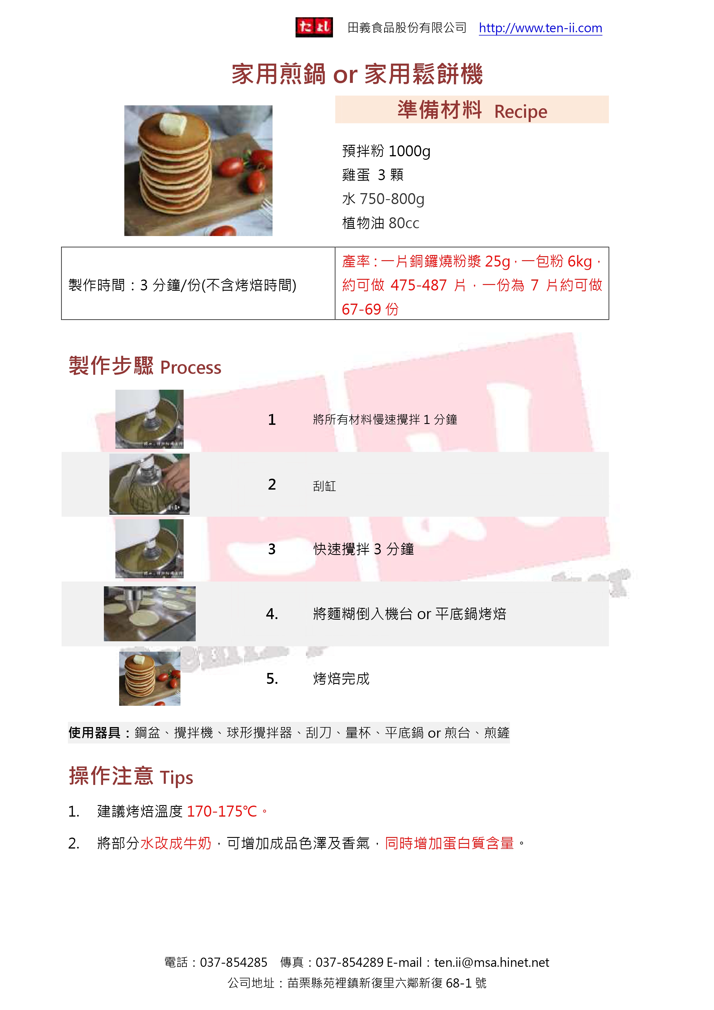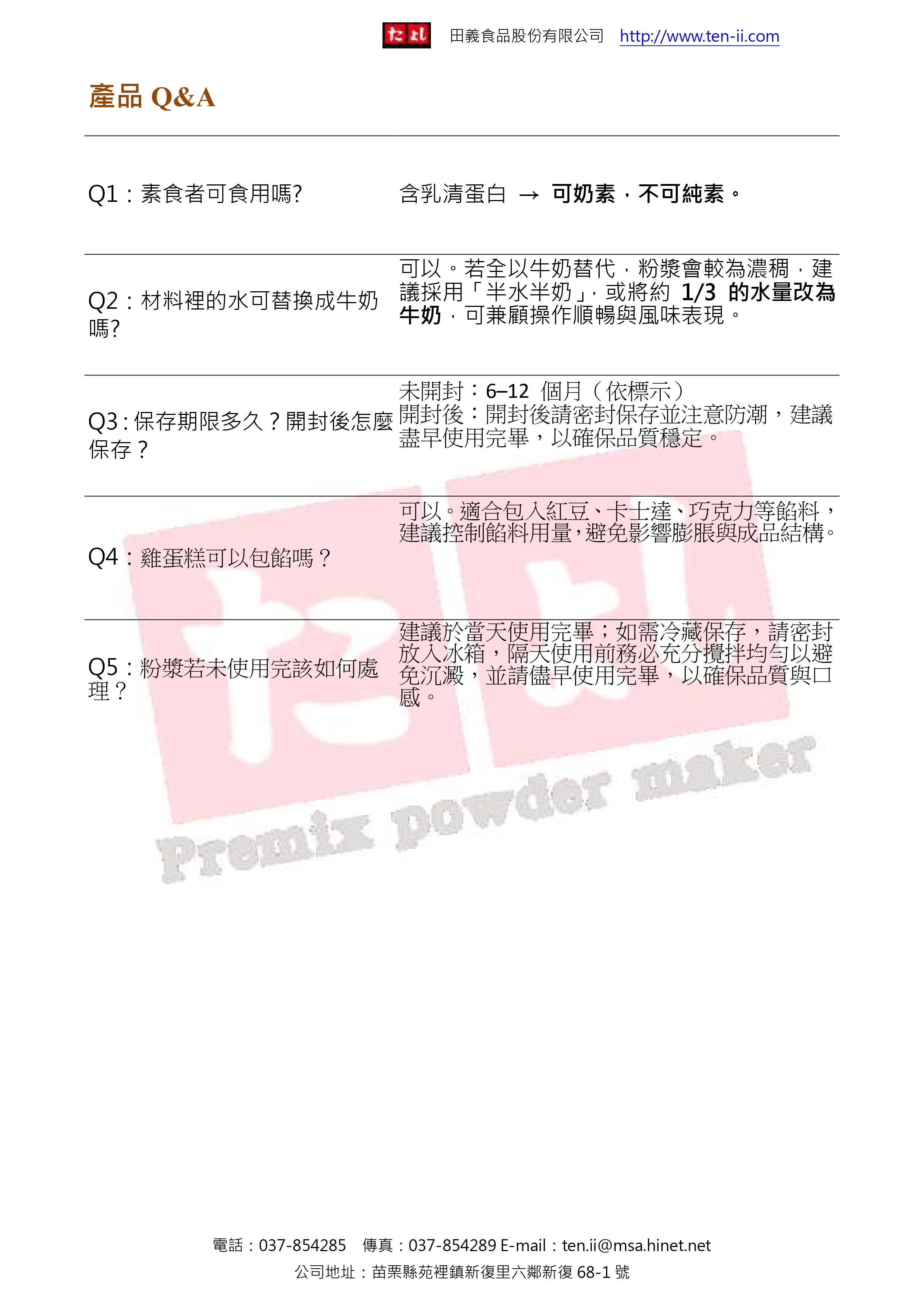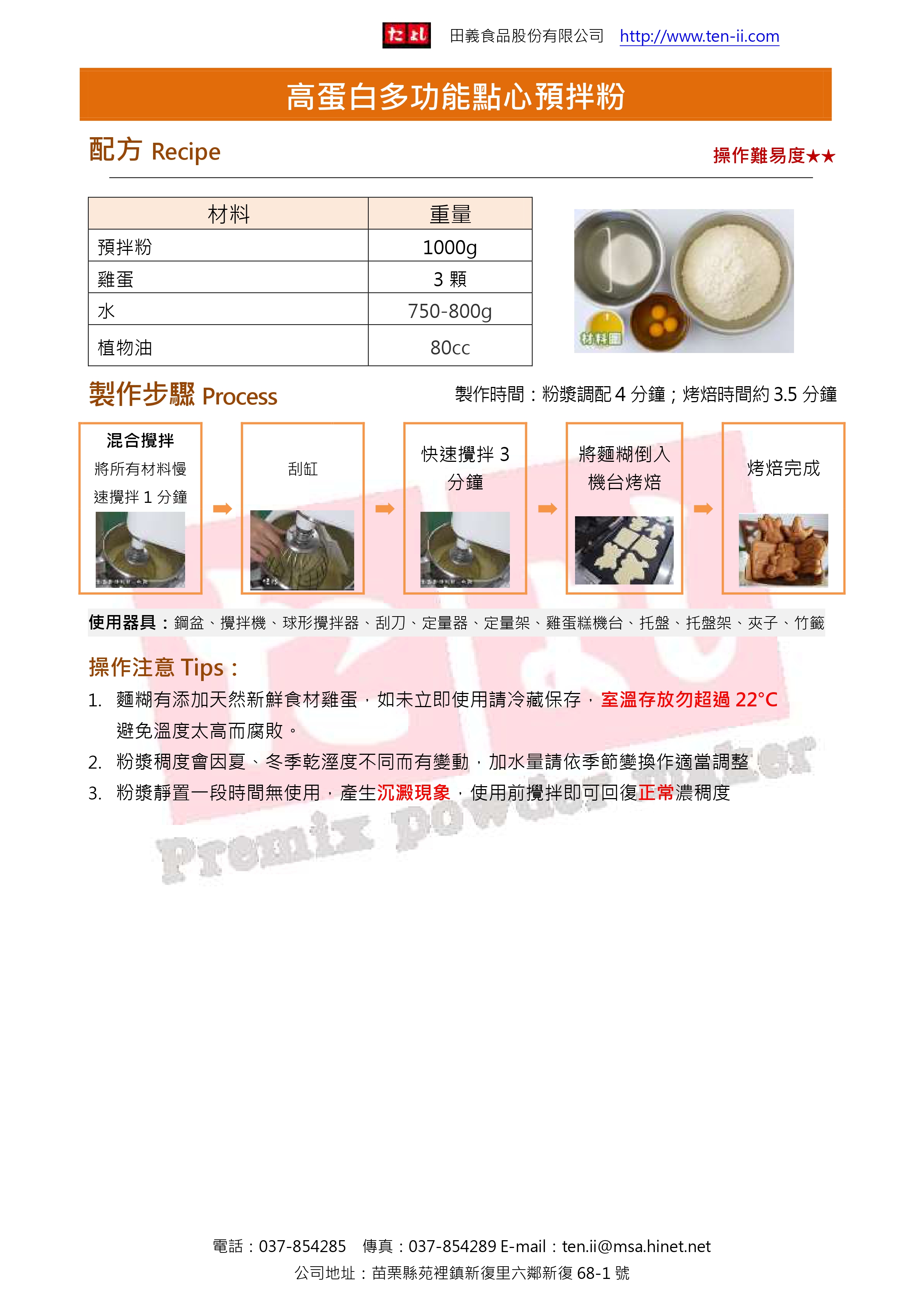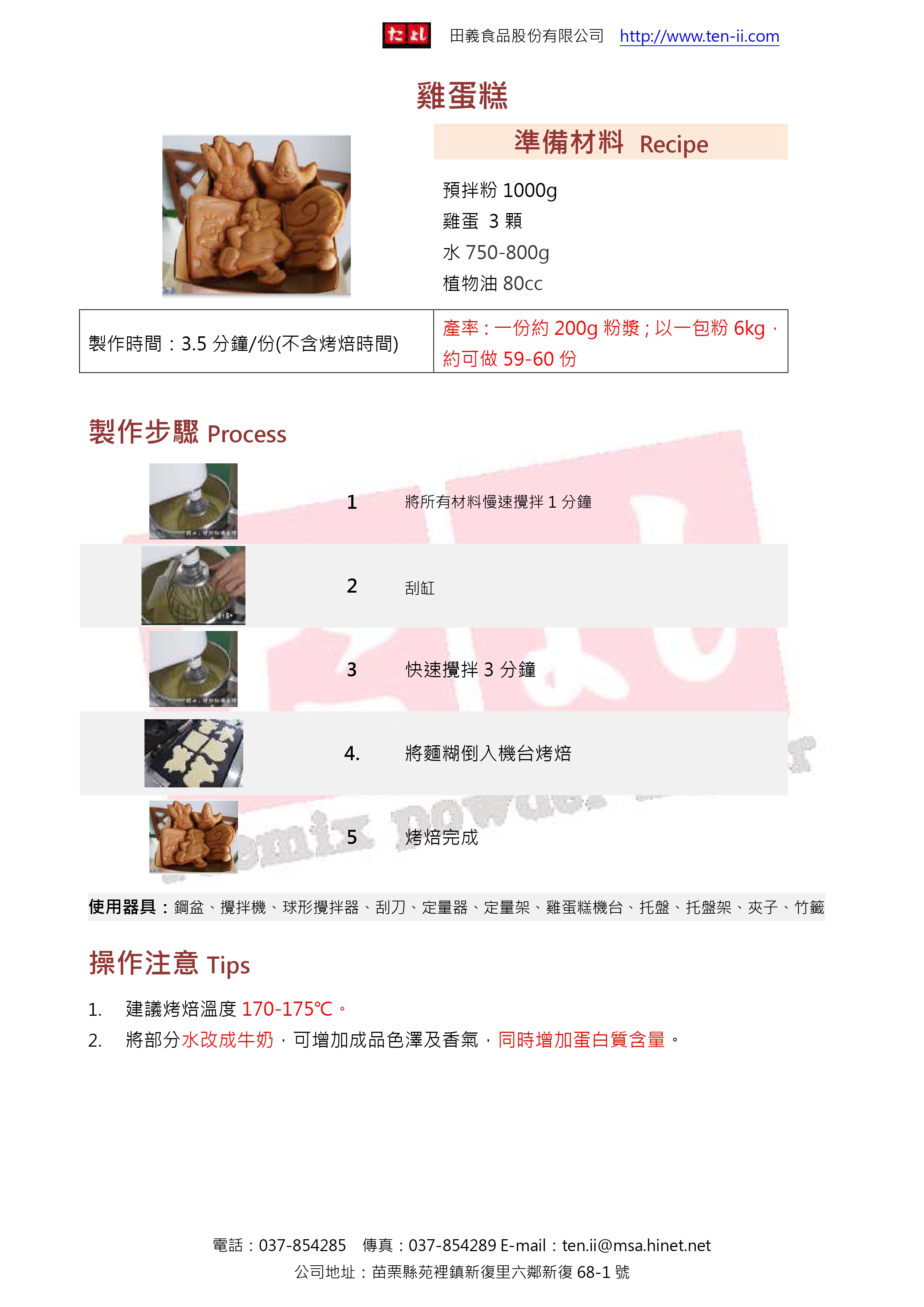 作法二:預拌粉6000g、雞蛋18顆(全蛋液900g)、水4500-4800g、植物油480cc
