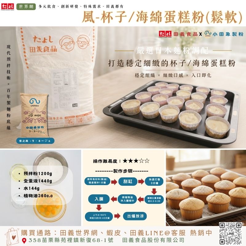 預拌粉1200g、全蛋液1440g、水144g、植物油360c.c
