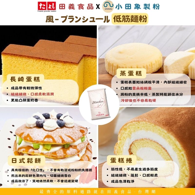 這款糕點粉用途廣泛,可用於製作各種產品,可用於西式和日式甜點以及奶油麵團,使成品口感濕潤蓬鬆