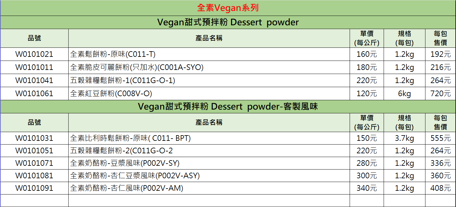 Vegan甜式預拌粉系列目錄